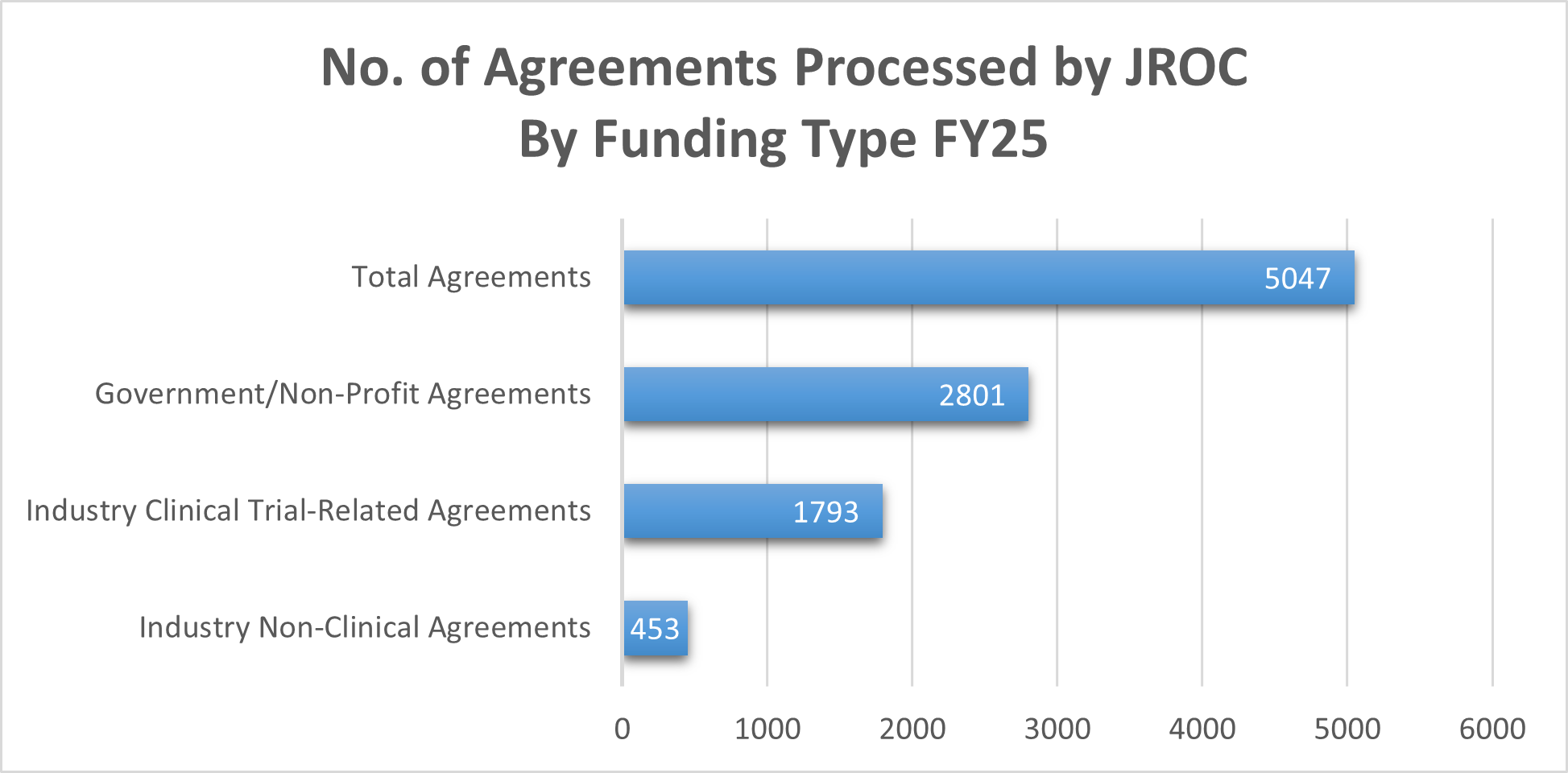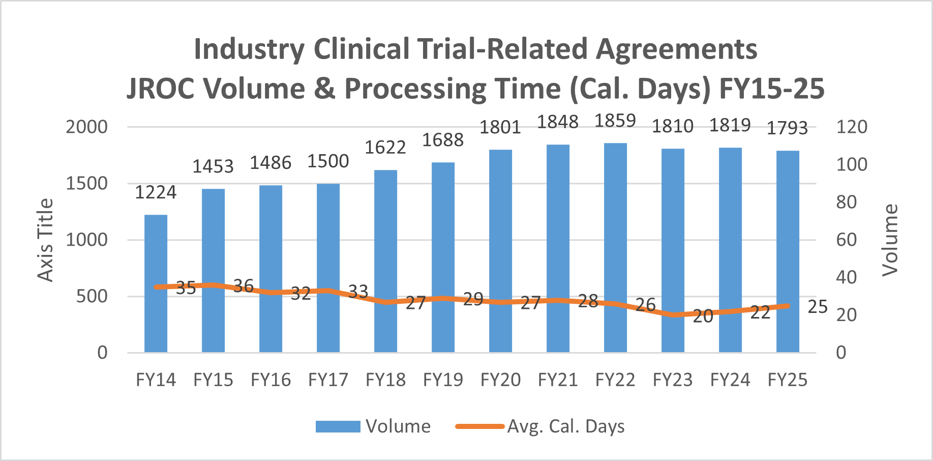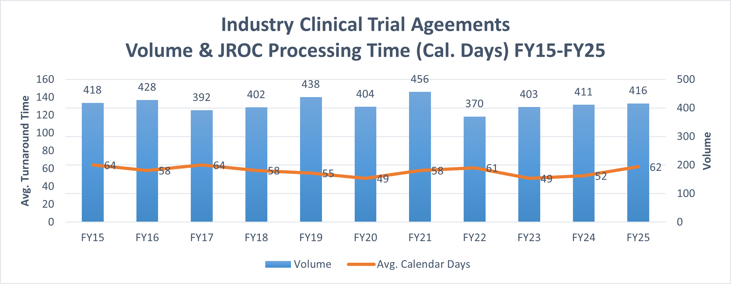 This graph incorporates data from all contracts processed by JROC related to industry clinical trials (e.g. Clinical Trial Agreements, Confidentiality Agreements, Amendments, Service Agreements related to a Clinical Trial, etc.).